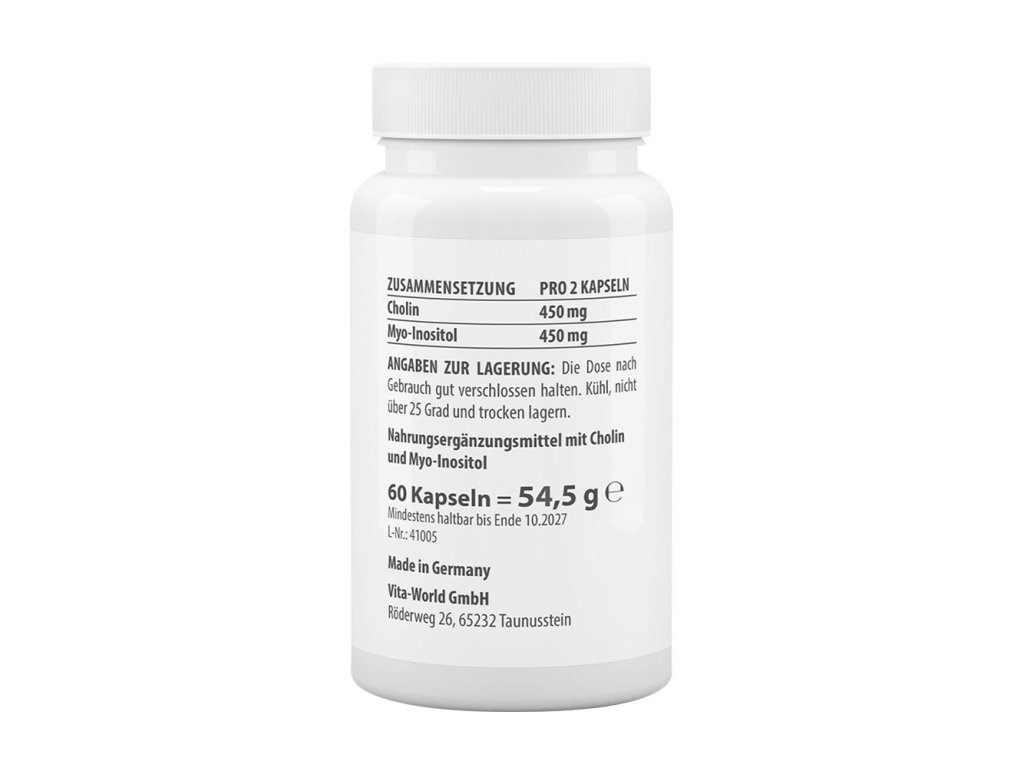 Cholin je poloesenciální živina. Tělo si jej dokáže částečně vyrobit samo, ale ne v dostatečném množství. Cholin by proto měl být přijímán v potravě, nachází se především v živočišných produktech. Cholin hraje v těle důležitou roli. Je součástí fosfolipidů, které jsou potřebné k tvorbě buněčné membrány. Nejznámější je lecitin, také známý jako fosfatidylcholin. Cholin také přispívá k normálnímu metabolismu lipidů a normální funkci jater. Je také potřebný pro tvorbu acetylcholinu. V našem produktu používáme rostlinný cholin bitartrát, který tělo umí velmi dobře využít. Tímto způsobem si vegetariáni i vegani mohou svůj jídelníček doplnit o cholin.Inositol, také známý jako vitamin B8, byl dříve považován za vitamin, protože má některé podobnosti s vitaminy skupiny B. Tento fakt je dnes považován za zastaralý, protože bylo zjištěno, že tělo si dokáže inositol vyrobit samo – z glukózy. V minulosti byl inositol také známý jako „svalový cukr“ díky své sladké chuti. Inositol se nachází téměř ve všech tkáních lidského těla a je nezbytný pro správné fungování buněčných membrán a nervového systému. Nejvyšší koncentrace inositolu se nacházejí v mozku, kde hraje roli transportéru. Protože se obě účinné látky vzájemně posilují, používáme v našem produktu cholin myo-inositol v ideálním poměru 1:1.