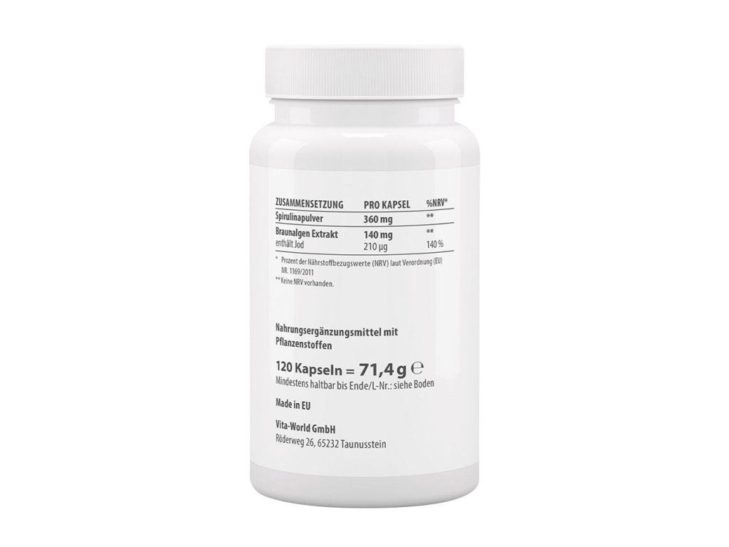 Jód přispívá k normální tvorbě hormonů štítné žlázy a k její normální funkci. Spirulina je modrozelená mikrořasa, která se nachází ve slaných i sladkovodních jezerech. Kombinace těchto druhů řas zajišťuje různorodé složení přírodních látek.