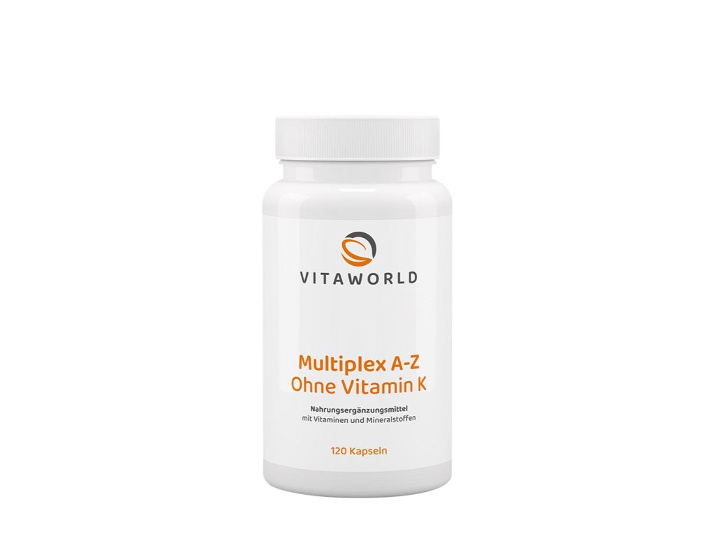 Multiplex bez vitamínu K obsahuje kombinaci nejdůležitějších vitamínů, stopových prvků a minerálů, které lidské tělo potřebuje pro životně důležité funkce. Vitamíny jsou organické sloučeniny, které musí být přijímány potravou, ale neslouží jako zdroj energie. Jsou nezbytné pro řadu procesů v lidském těle, například regulují využití bílkovin, sacharidů a minerálů, chrání tělo před volnými radikály a jsou potřebné pro tvorbu buněk, hormonů a enzymů.Dostatečný přísun různých vitamínů je také nesmírně důležitý pro nervový a imunitní systém, stejně jako pro svaly, pokožku, zuby a kosti. S vodou rozpustnými vitamíny B1, B2, B6, B12, C, biotinem, niacinem, kyselinou pantotenovou a kyselinou listovou, stejně jako s vitamíny rozpustnými v tucích A, D a E, obsahuje Multiplex bez vitamínu K mnoho z nejdůležitějších vitamínů, které tělo potřebuje. Kromě toho Multiplex bez vitamínu K obsahuje řadu životně důležitých látek, jako jsou minerály a stopové prvky, které podporují účinek vitamínů a jsou také nezbytné pro fungování lidského těla.