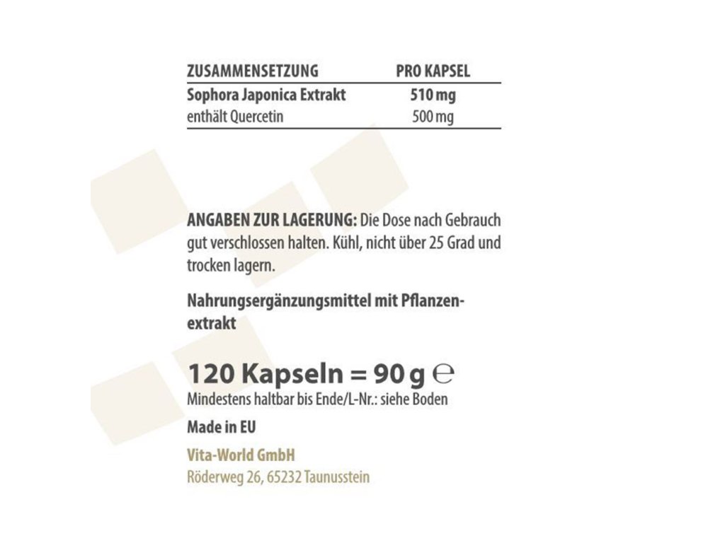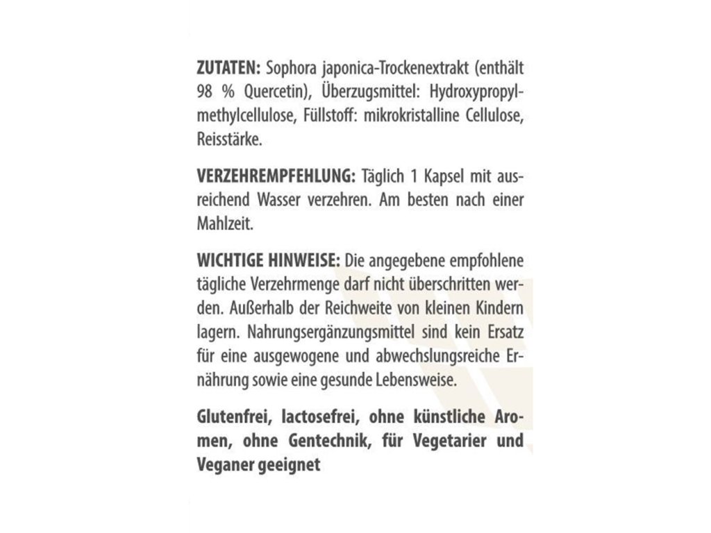 Quercetin, který používáme, pochází z čistě rostlinného zdroje a získává se z květů japonského pagodového stromu (Sophora japonica). Potraviny a čaje z čerstvých i sušených květů japonského pagodového stromu jsou trvale součástí jídelníčků ve východní Asii. Každá kapsle obsahuje vysokou dávku 500 mg 100% přírodního quercetinu.