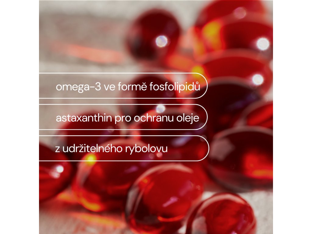 | Složení (2 kapsle): | Krillový olej 1 000 mg, fosfolipidy 400 mg, omega-3 220 mg (EPA 120 mg, DHA 56 mg), cholin 50 mg, astaxanthin 100 µg |