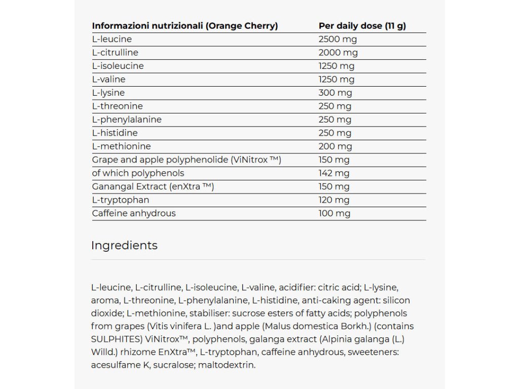 Essential AMINO Energy je matrix složený z esenciálních aminokyselin získaných rostlinnou fermentací a obohacený o bezvodý kofein, polyfenoly ViNitroxTM a extrakt Alpinia galanga enXtraTM, vyvinutý pro podporu a optimalizaci úrovně koncentrace, reaktivity a energie během výkonu.